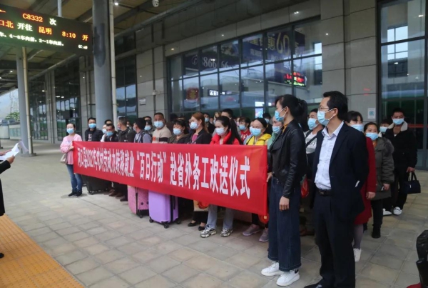 县人社局积极向相关部门协调为本次外出务工人员提供口罩;河口火车北站为本次外出务工人员开通了绿色通道,提供便利;负责组织外出的人力资源公司为他们提供了早餐及保障服务。县交通局、县住建局等相关单位负责人及首批外出去深圳务工的人员共53人参加欢送仪式。