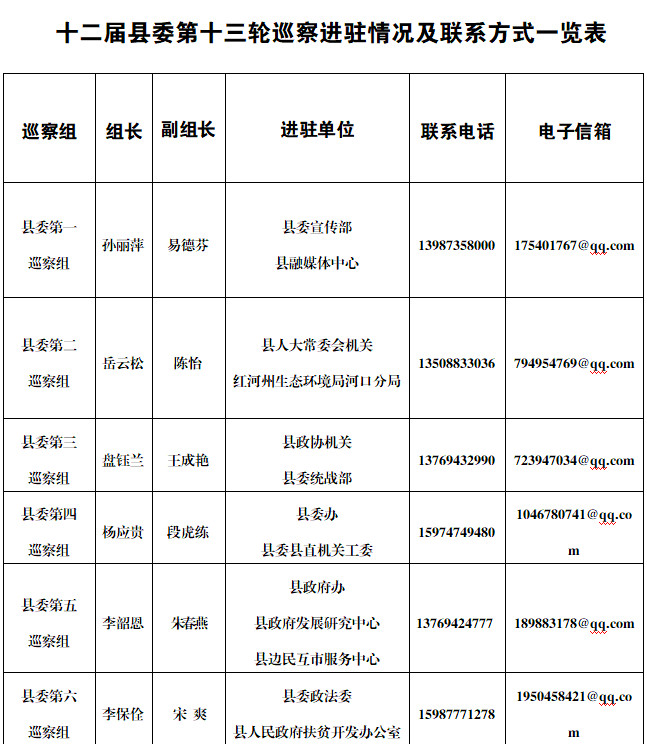 根据县委统一部署,十二届县委第十三轮巡察进驻全面启动。截至9月7日,县委6个巡察组已全部进驻,对县委办、县人大常委会机关、县政府办、县政协机关、县委宣传部、县委政法委、县委统战部、县委县直机关工委、县人民政府扶贫开发办公室、红河州生态环境局河口分局、县边民互市服务中心、县政府发展研究中心、县融媒体中心13个单位开展为期30天的巡察。