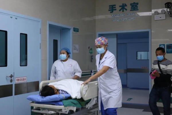 奎洁艳(前一)护送患者出手术室