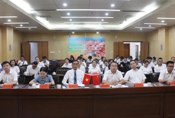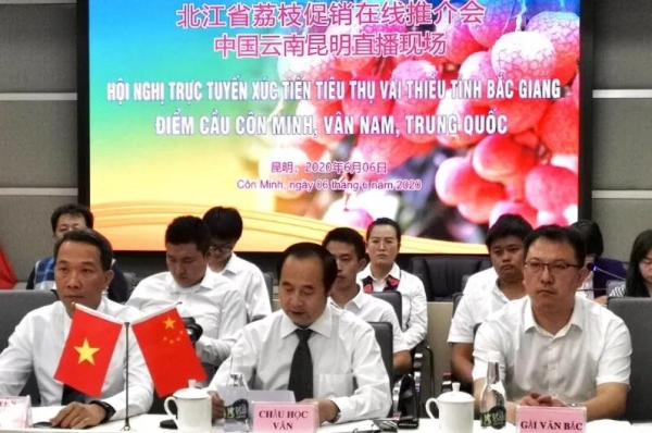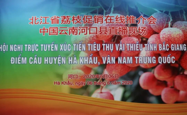 6月6日,由越南北江省工贸厅、广西壮族自治区商务厅、云南省商务厅共同举办的中国—越南荔枝促销在线推荐会在线上举行,河口县设直播分会场参加推介会。红河州商务局副局长白玉文,河口跨合区管委会常务副主任、副县长古明峰在河口分会场出席推介会。