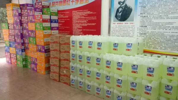 2月27日,河口百大信合超市将100桶84消毒液、600瓶洗手液、100件方便面等价值25280元的抗疫物资捐赠到了县红十字会,支援值守在一线的工作人员。(尹翰)