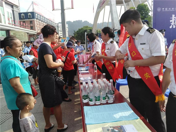 活动现场,刘文杰与河口出入境边防检查站官兵、河口海关领导干部一起发放《中华人民共和国出境入境管理法》《中华人民共和国反恐怖主义法》《中华人民共和国国家安全法》等宣传资料,接受来客咨询。