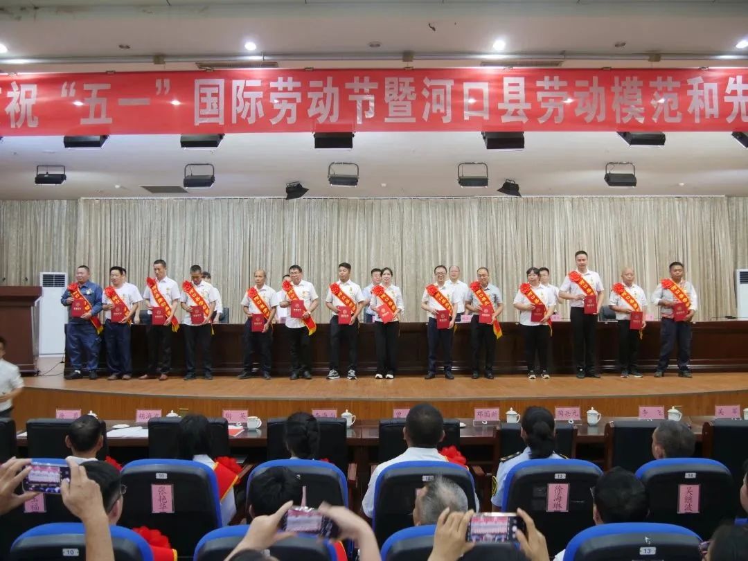 在庄严的国歌声中,大会拉开帷幕。会议宣读了关于表彰2023年河口县劳动模范和先进工作者的决定,授予唐红武等17位同志“河口县劳动模范”荣誉称号,授予胡海波等18位同志“河口县先进工作者”荣誉称号。35名受表彰同志上台领奖,1名劳动模范代表宣读了《河口县劳动模范和先进工作者倡议书》,3名劳动模范和先进工作者代表分享了在各自岗位上辛勤劳动、发挥才干的先进事迹。