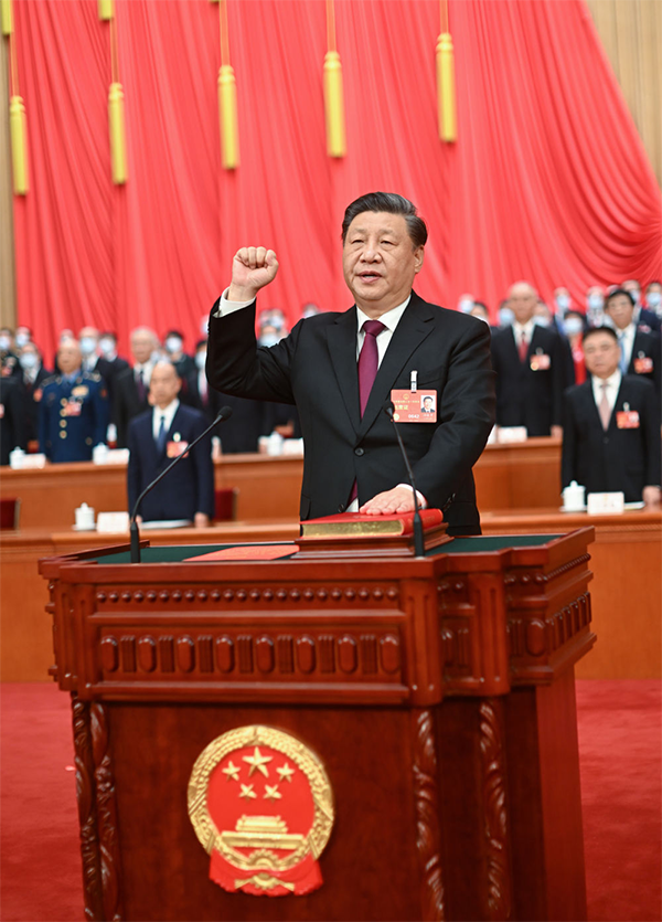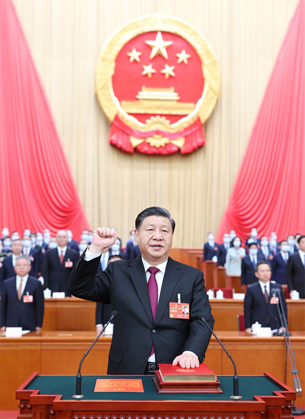 3月10日,十四届全国人大一次会议在北京人民大会堂举行第三次全体会议。习近平全票当选中华人民共和国主席、中华人民共和国中央军事委员会主席。这是习近平进行宪法宣誓。新华社记者 鞠鹏 摄