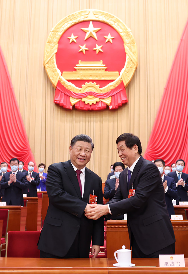 3月10日,十四届全国人大一次会议在北京人民大会堂举行第三次全体会议。习近平全票当选中华人民共和国主席、中华人民共和国中央军事委员会主席。这是习近平同新当选的全国人大常委会委员长赵乐际握手。新华社记者 黄敬文 摄