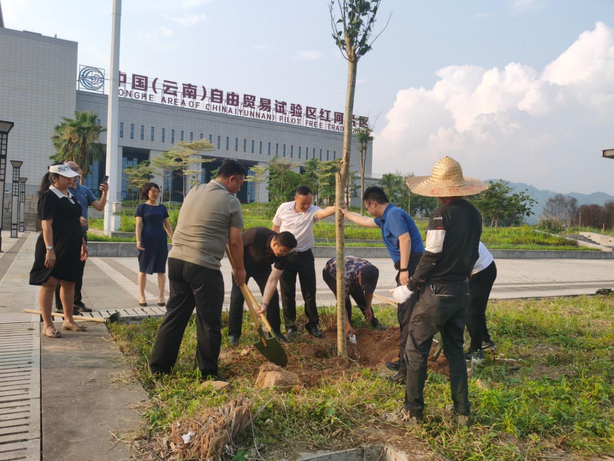 6月12日,河北陆港集团总裁刘银朋,河北陆港集团执行总裁郭全福到中国(云南)自由贸易试验区红河片区 (河口边境经济合作区)投资考察,州政府党组成员、中国(云南)自由贸易试验区红河片区 (河口边境经济合作区)工作委员会委员、书记(兼)鞠云昆、区县领导(王孝刚、李华梅、龙蜀昆)、蒙自经开区管委会副主任木伟及蒙自经开区红河综保区投资促进局副局长赵骄陪同。为纪念此次投资考察,助力河口城乡绿化美化,座谈会结束后,鞠云昆书记、刘银朋、郭全福及陪同领导共同参与“企业林”植树活动,种下具有纪念意义的紫檀,为河口园区增绿添色。
