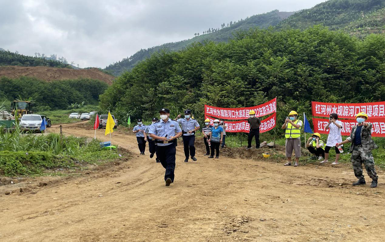 演练模拟“河口县发生强降雨,导致大田房水库围堰发生垮塌,威胁工作人员的施工安全,存在淹掉机械设备和材料的风险,造成很大的经济损失。”接到险情后,河口县第一时间启动应急预案,调集县防汛抗旱指挥部、县公安局等相关部门救援力量,组成各职能小组迅速赶赴现场救援。演练现场设置指挥组、抢险组、救援组、后勤保障组等7个小组,演练中,各救援工作组,按照应急预案做到反应迅速、全力协作,在确保人员安全的情况下,圆满完成演练各项任务。随后,还开展了消防、反恐、事故应急救援联合演练。
