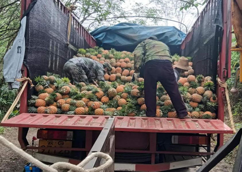 为表达对防疫人员的心意,近日,南屏社区子丫小组几个菠萝种植户在参加完核酸采集后早早上山,自己采摘、装运,半天时间, 6.5吨本地香水小菠萝就装满一车,通过河口县红十字会,送往河口县疫情防控一线。(坝洒农场管委会)