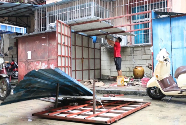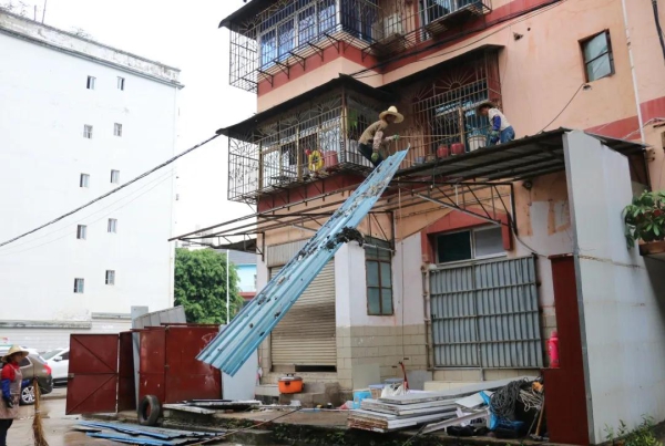 红房子小区位于北山片区,隶属河口镇北山社区,是一个典型的开放式居住小区。长久以来,由于管理不到位,有个别业主私自占用公共区域扩充私人住宅空间,一楼的人行道被占用,建起了砖混结构的彩钢瓦房,不仅影响了小区的生活环境,还挤占了其他业主的公共资源,又加上常年风吹日晒,许多板房已经老化,随时有掉落的危险,存在很大的安全隐患。工作组通过摸底调查,在拆除前期下达了整改通知书,对于逾期没有自行整改的业主,统一对违建进行拆除。