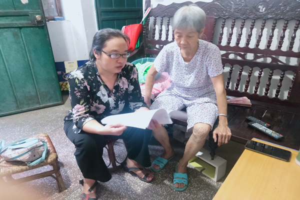 图为县能源局局长陈蕾在给退休干部陈美玉同志讲解