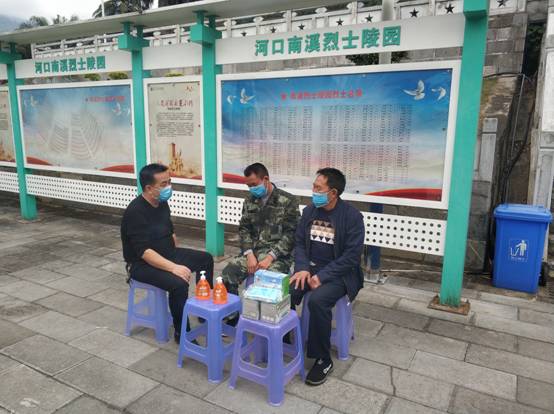 为应对当前新冠肺炎防控的严峻形势,减少病毒烈士陵园的传播,1月27日,河口县退役军人事务局党组副书记、副局长赵云同志深入水头烈士陵园、南溪烈士陵园和蚂蝗坡烈士陵园开展检查指导,为烈士陵园陵管员送去医用口罩、洗手液等必需品,并就当前陵园防控工作做了安排。要求,一是做好春节期间值守工作,严格做好祭扫人员登记,在工作期间必须戴口罩、勤洗手;二是按时打扫陵园环境卫生,在陵园洗手台摆放洗手液,免费为祭扫人员提供口罩等;三是祭扫人员在祭扫时出现身体不适,要及时联系河口县人民医院进行救治。