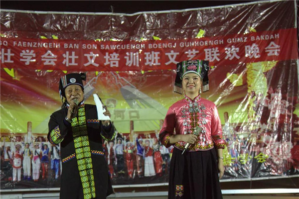 开班仪式上,文山州壮学会副会长、壮文传承人陆生熊老师从壮语文字各支系发音声调、韵母和声母知识、单词组成和例字练读等方面,深入系统地讲解了壮文字拼写规则、语法基础和各支系方言词汇,还运用壮族山歌对唱、学唱壮族山歌等方式提高学员们对学习壮文的兴趣。培训还对党的民族政策和民族法律法规进行讲解。
