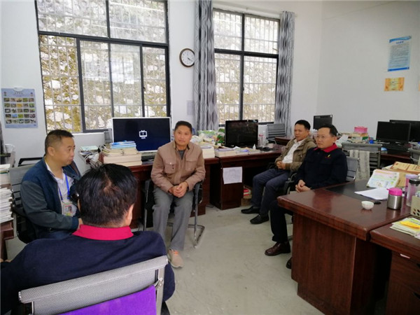 (图为县发改局工作人员和龙堡村小学校领导对学生粮安全供应进行交流)