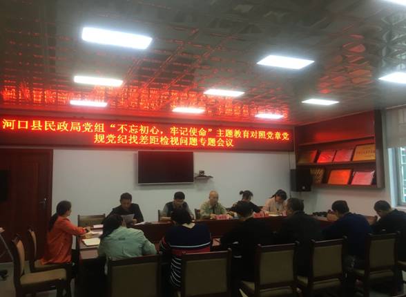 为深入贯彻落实习近平总书记关于“不忘初心、牢记使命”重要论述精神,围绕“守初心、担使命、找差距、抓落实”的总要求。2019年11月20日,召开河口县民政局党组对照党章党规找差距专题会议。会议由局党组书记、局长何明同志主持会议,河口县委第十四巡回指导组莅临指导,县民政局班子成员和全体党员干部参加。