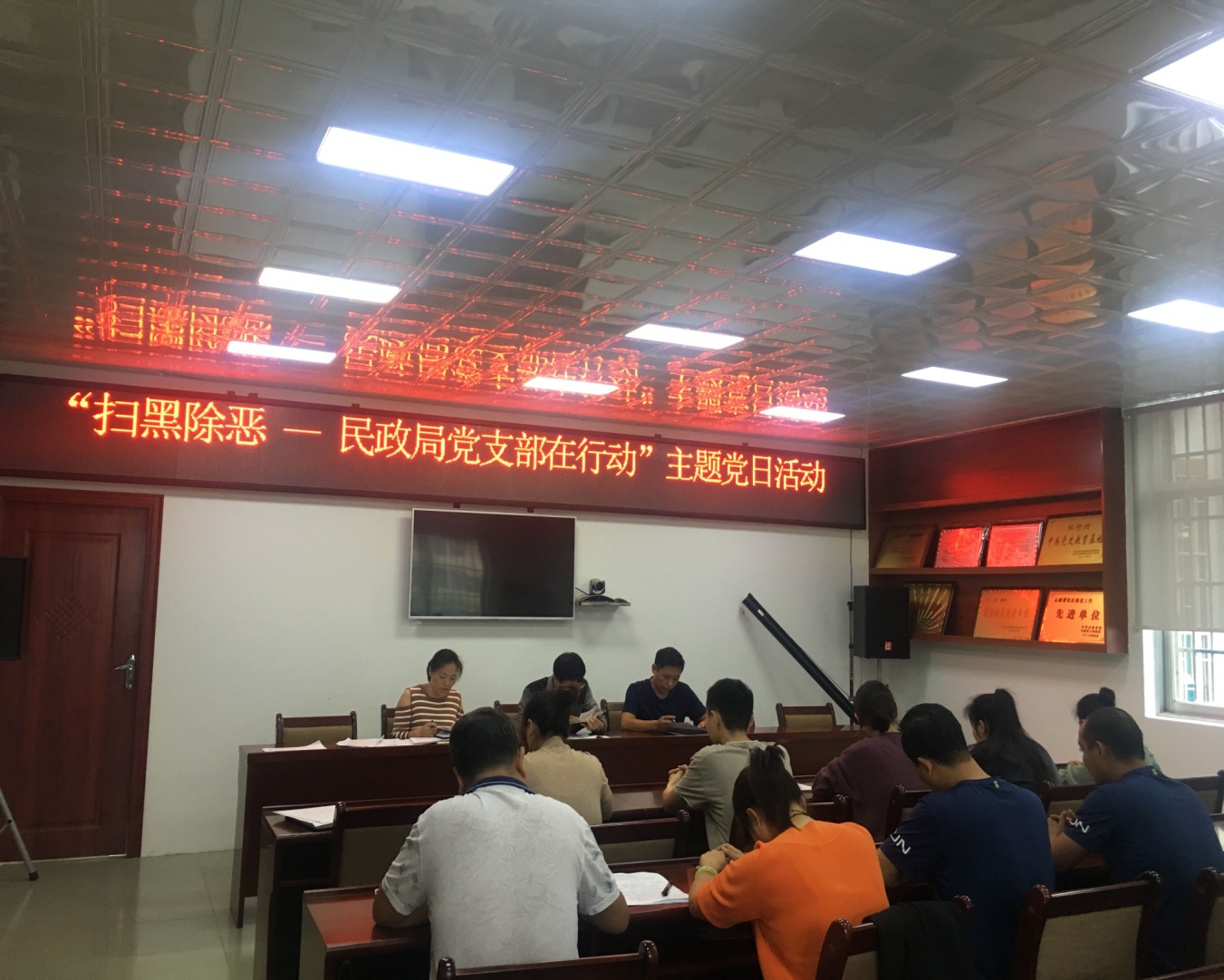 党支部书记何明同志强调民政局要特别注重排查利用家庭势力、宗族势力、黑恶势力的“村霸”把持基层政权,操纵低保金、民政救助救济金名额分配、发放和侵蚀破坏基层政权、操纵干扰妨碍破坏基层换届选举和村(居)民自治等涉黑涉恶线索。