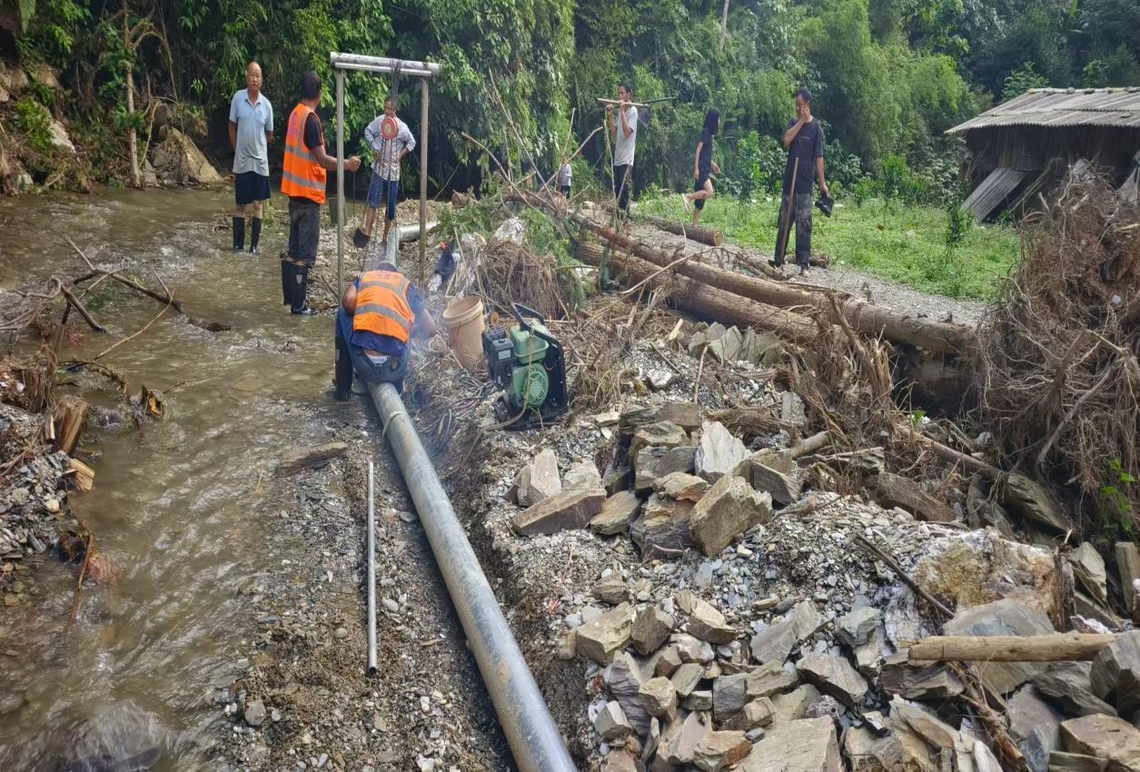 2025年7月,县水务局在汛期日常巡查中发现,金鸭塘取水坝所处区域因暴雨导致山体滑坡、河道受阻,导致水坝至沉沙池管道堵塞,无法对桥头乡集镇片区进行供水。为切实解决供水问题,县水务局、县住建局、桥头乡政府现场办公、实地勘察,共同研究制定了问题解决方案,各部门按照职责进行分工合作。一是由县水务局督促指导县泽龙供水公司尽快编制通水施工方案并组织实施,同时从取水坝上游新架设DN150镀锌钢管300米应急供水管道至沉沙池内,恢复沉沙池供水;二是由县住建局从沉沙池架设长约7千米的PE200供水主管至桥头乡集镇水厂,并保障供水正常;三是由桥头乡政府及水厂做好水源点及供水设施日常巡查排查管护工作。经过近30天的多方联动合作,2025年8月18日金鸭塘取水坝水源工程实现对桥头乡集镇片区水厂试通水。