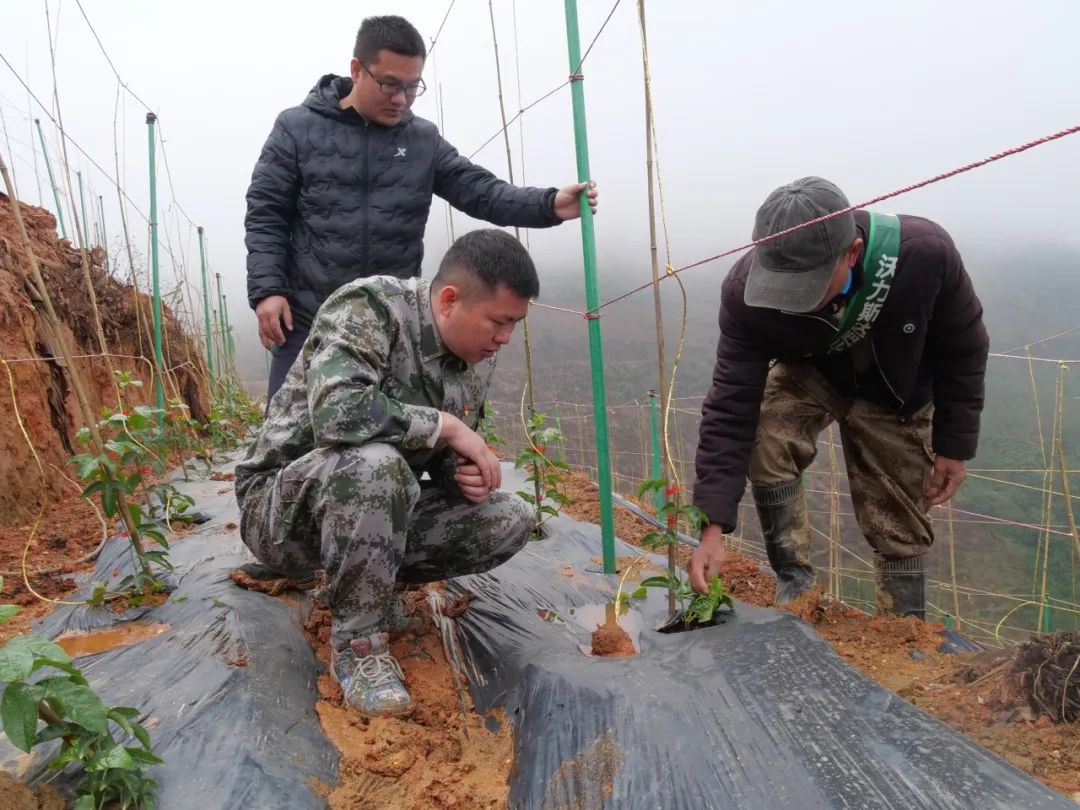 盘健(中)在牛塘村百香果基地察看果苗移栽情况