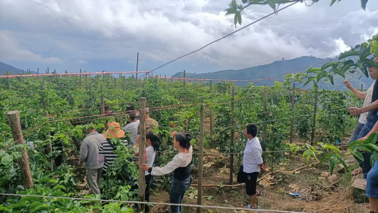 乡村振兴,科技先行。为了有效提高种植户的种植技术和管理能力,加快推进八角村百香果产业发展,八角村党总支书记熊大成多次邀请云南云上社农村发展有限公司、美蝶农业发展农民专业合作社的种植专家到实地开展百香果种植技术培训,县农科局也组织易联农业科技有限公司的技术人员到八角进行指导。培训过程中,专家们把课堂搬到田间地头,采取“现场讲解+田间指导”的方式,对百香果的选种、种植模式、病害防治、管理维护、施肥、采摘、销售等相关理论知识进行全方位的科普,传授方法技术,帮助培育一批懂技术、会管理的种植户。