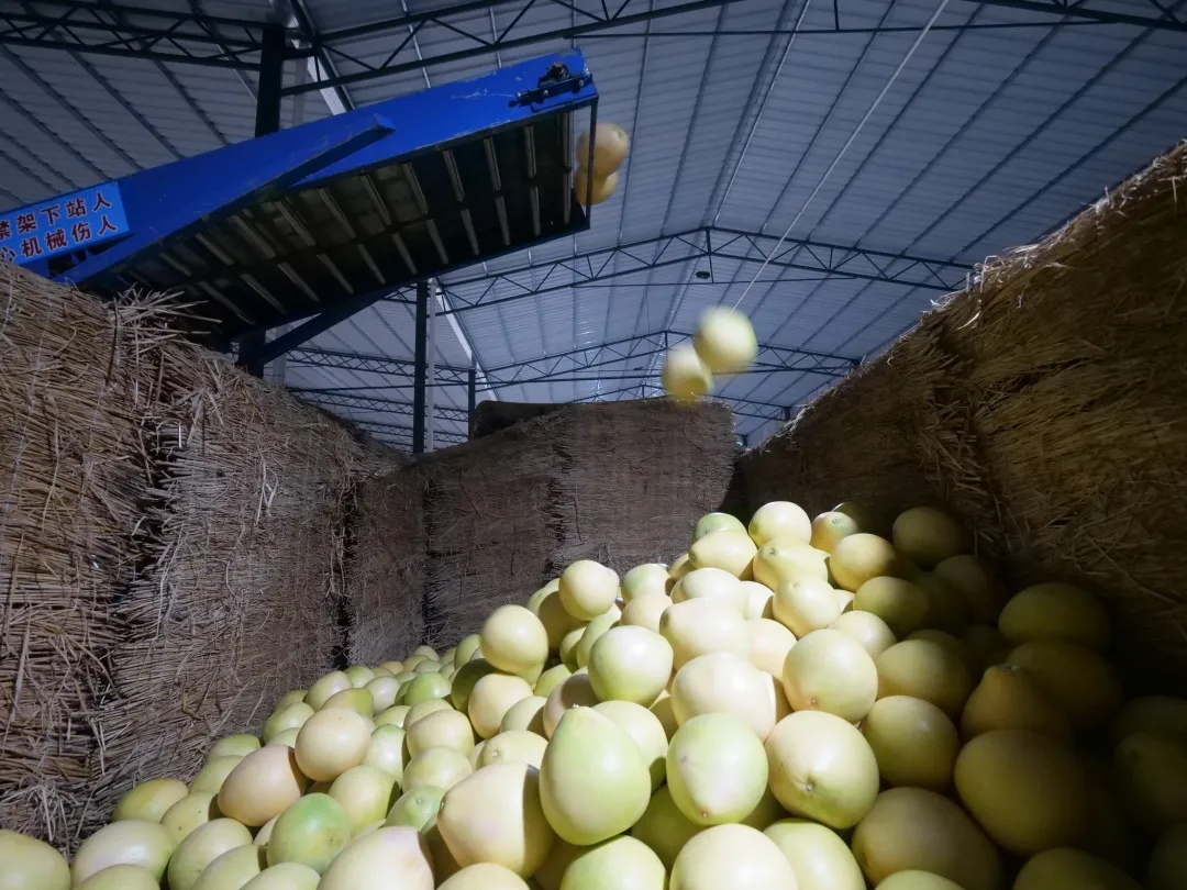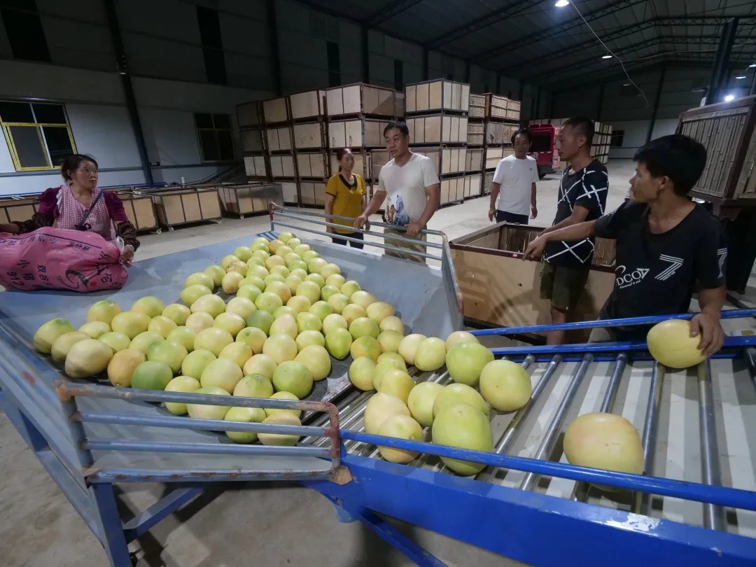 在各级党委政府的支持下,作为红河州授牌的就业扶贫车间,河口明星农业科技发展有限公司还在桥头乡下湾子村投资新建起了水果分拣和包装厂房,为村集体带来了一定经济收入。在采摘当天投入使用的新车间里,工人们在忙着分拣果品,借助输送带将挑选好的柚子连夜打包装车,首车准备发往福建。