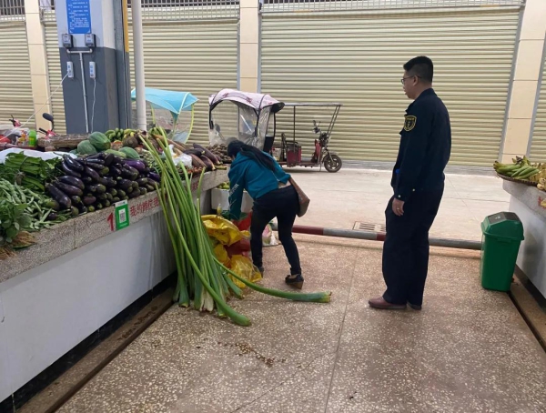 行政主管部门包区,市场监督管理局对广丰市场分片区、分摊位履行“包保责任”,将广丰市场实际使用的163个摊位划分为10个网格区域,每个网格区域由2名网格员联合值守检查,20名网格员包保负责到每个摊位,有效打通市场环境治理的“末梢”、“微细胞”。截至目前,网格员出动开展市场检查360余人次,发现占道经营、污水乱排、垃圾乱丢、杂物乱堆等问题80余条,并及时予以解决处理。市场摊贩业主包干。宣传、督促摊贩业主按照“门前五包”要求,对自己承包的摊贩推行“一米线包保”,即摊贩周边1米线范围内的卫生保洁由该摊贩自行负责,即扫即清,填补了市场保洁人员卫生打扫不及时的漏洞。市场主办方包底。为了保持市场干净、整洁、卫生,市场主办方切实履行好卫生包保责任,聘请了6名管理人员、10名保洁人员,“两班倒”轮流在市场内履行管理及卫生保洁工作,每天工作时间自早7点至晚7点,中午不休息,保持卫生干净整洁常态化。
