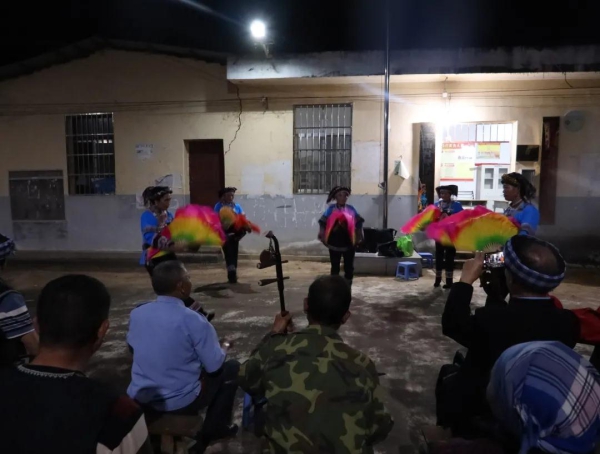 入夜后,老汪山坪子寨小组响起阵阵歌声,一群盛装打扮的布依族阿姐在小组活动室前为大家表演布依族传统花灯,作为布依族传统戏剧之一,坪子寨的花灯文艺队是桥头乡唯一一支布依族花灯表演队,长期在辖区内进行布依族花灯演出,为花灯文化传承作出贡献。