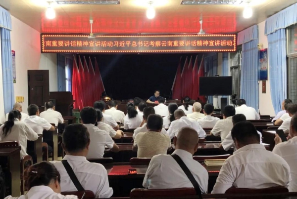 近日,县委常委、县委宣传部部长吕涛到南溪农场开展习近平总书记考察云南重要讲话精神宣讲活动,从增强“四个意识”、坚定“四个自信”、做到“两个维护”的高度,深刻认识南溪农场在全县发展大局中的突出特点以及职责使命,切实把学习贯彻讲话精神引向深入。