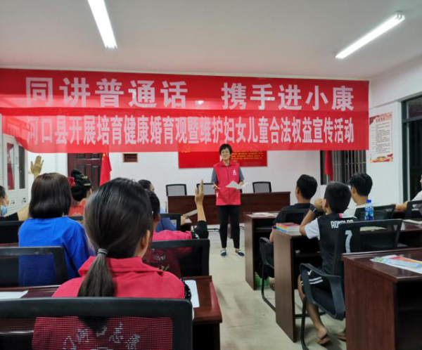 9月18日,河口团县委、县文明办、县妇联、县同泽雅苑汉文化协会共同走进幸福小区开展志愿服务活动,向社区群众普及普通话和健康文明的生活方式。