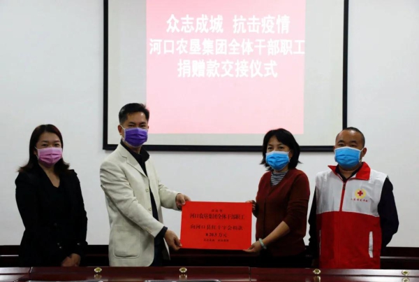 2月26日,河口农垦集团公司党委书记、董事长黄灵,工会主席饶庆作为代表向河口县政府转交一笔来自河口农垦集团干部职工的捐赠金205422元,这笔捐款将定向用于我县新冠肺炎疫情防控工作。县政府副县长龙艳代表县政府接受捐款。