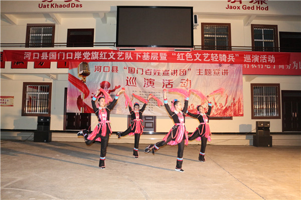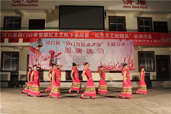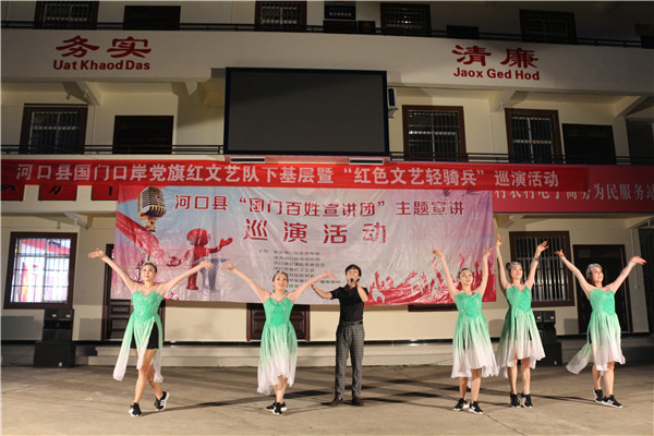 巡演开始,国门口岸党旗文艺队、国门百姓宣讲团和莲花滩乡新街社区文艺队在舞台精彩表演显得格外卖劲,《让你听懂我的语言》、《我的脱贫故事》《母亲是中华》等充满了鲜明的时代特征和乡土气息,赢得观众的热烈掌声。歌曲《河口因你而美》歌声高亢悠扬,唱出了新农村、新风貌,唱出了现在翻天覆地的新变化,充分表现了民族的豪情壮志,歌唱了对伟大祖国的热爱,赢得村民热烈掌声。