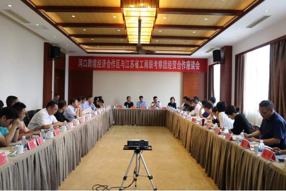 调研座谈会上,在观看了河口招商宣传片、听取李兴锟同志作招商推介后,老街经合区管委会、河口跨合区管委会、江苏省工商联考察组三方围绕中越跨境经济合作区的建设情况等进行了深入探讨和交流。考察组详细了解了中越双方的投资政策,并表示河口地理位置优越,具有互联互通优势及优惠的投资政策,希望今后能加强与越南、河口的联系,充分借助跨合区平台,争取未来有更多的项目,推动三方经济领域的合作,共谋发展。