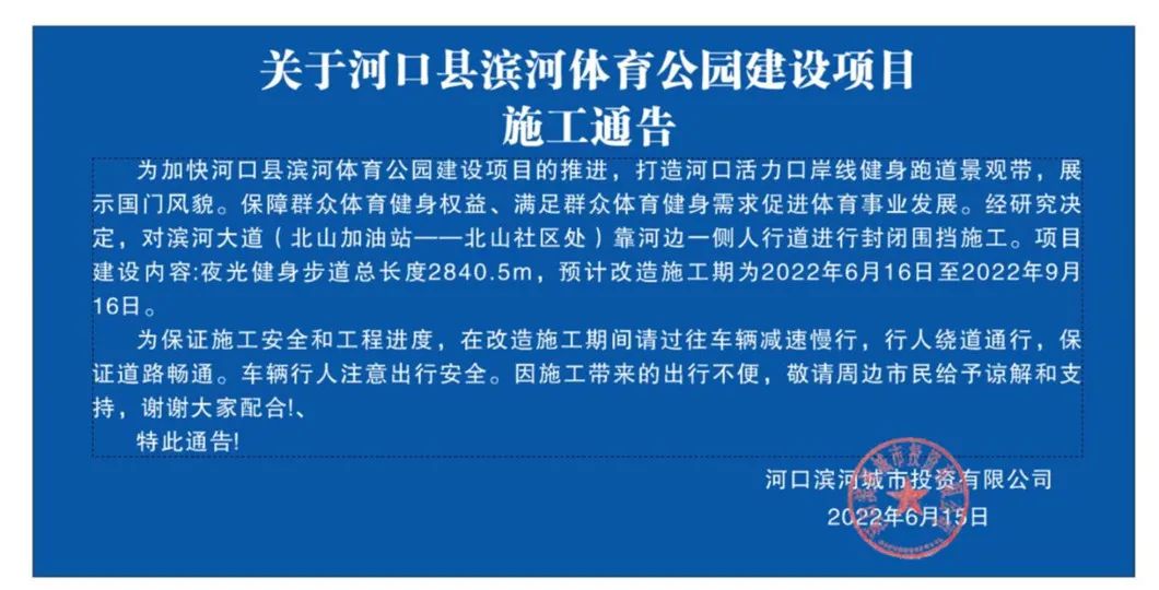 该项目主要建设内容共涉及范围42249.98平方米,共涉及常规球类、健身步道类、广场与器械类、儿童活动设施类四大类提升改造工程,分为健身步道和休闲球场建设项目,其中,健身步道由滨河夜光健身步道和健身步道两项组成。目前河口县正在对滨河大道(北山加油站至北山社区段)靠河边一侧人行道进行封闭围挡施工,主要涉及夜光健身步道建设项目,总长度为2840.5米,预计改造工期为2022年6月16日至2022年9月16日,项目总投资2965.79万元。
