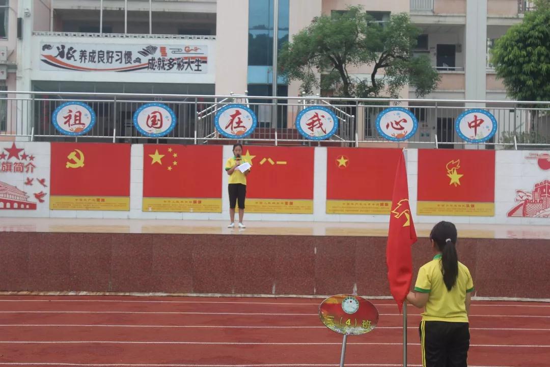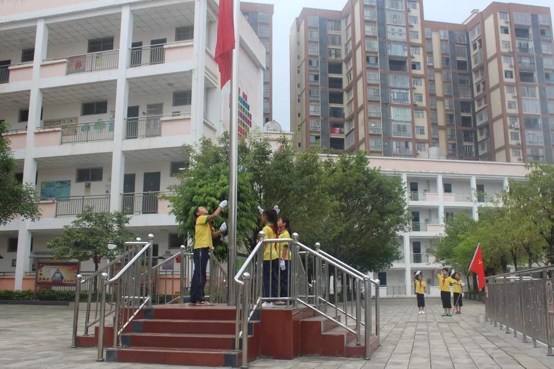 升旗仪式开始了,旗手和护旗手们护送着鲜艳的国旗和大队棋,在庄严的出旗曲中整齐有力地走向旗台。国歌奏响,全场肃静,学生行少先队礼,教师行注目礼,五星红旗在激昂雄壮的国歌声中冉冉升向校园上空。升旗后是国旗下讲话,六(2)中队的杨洋同学带来《向国旗敬礼》,响亮、动人的演讲给现场的同学带来了一次心灵的洗礼,增加了同学们对祖国、对国旗的爱戴和尊重。
