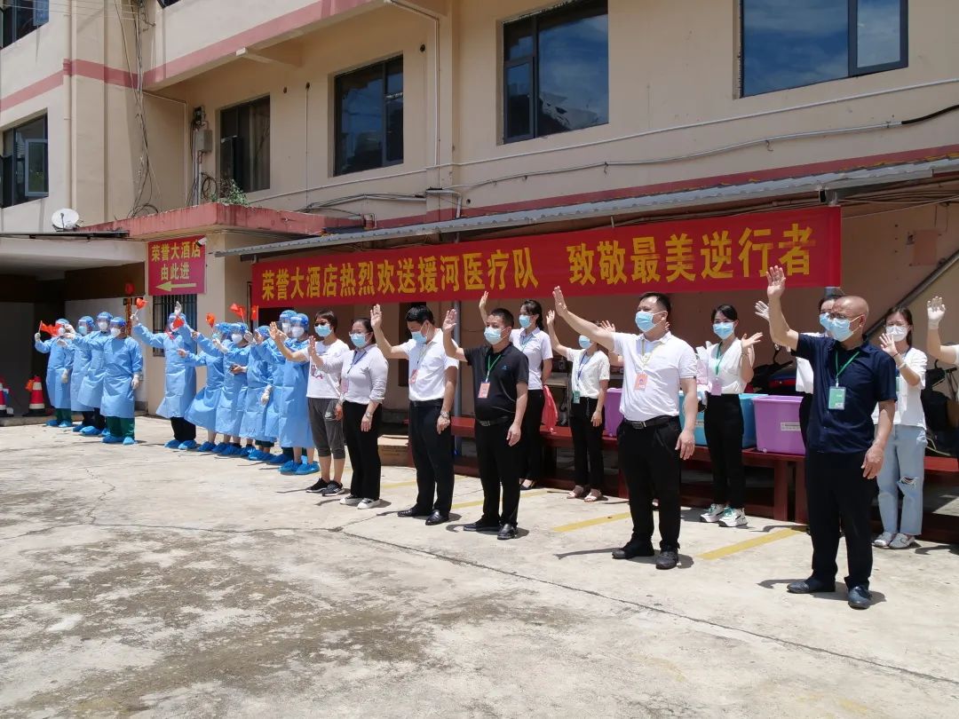 5月12日,正值国际护士节,州级和各兄弟县市派出的援河医疗队圆满完成支援任务,带着河口人民的深情厚谊,踏上归程。在疫情防控取得阶段性重大胜利之际,河口县举行援河医疗队欢送仪式送别英雄凯旋,以城市的最高礼仪,致敬最美逆行者,为他们送上来自国门河口最特别的节日祝福。县委副书记、县长邓瑞出席并讲话,县人大常委会主任林国才、县政协主席杨光云出席欢送仪式。