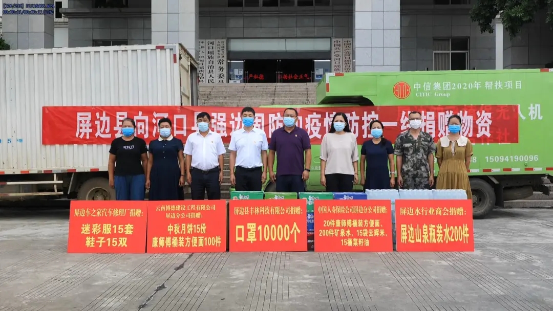 走访慰问当天,屏边县抗疫物资捐赠仪式在河口县行政中心举行,慰问组将屏边县爱心企业捐赠的矿泉水、方便面、口罩等抗疫物资移交给河口县,助力河口县边境疫情防控工作。屏边县人大常委会副主任候选人汪晋云,县政府副县长高芬,县政协副主席、县工商联主席马丽琼,县委“两新”工委书记万小羊及河口县人大常委会副主任、县总工会主席邓东艳、县政府副县长龙艳等领导参加上述活动。