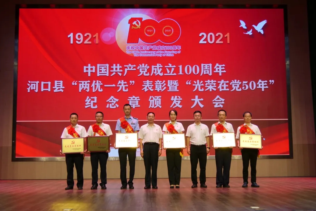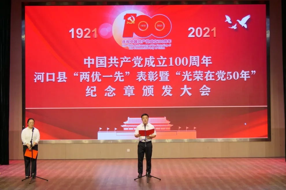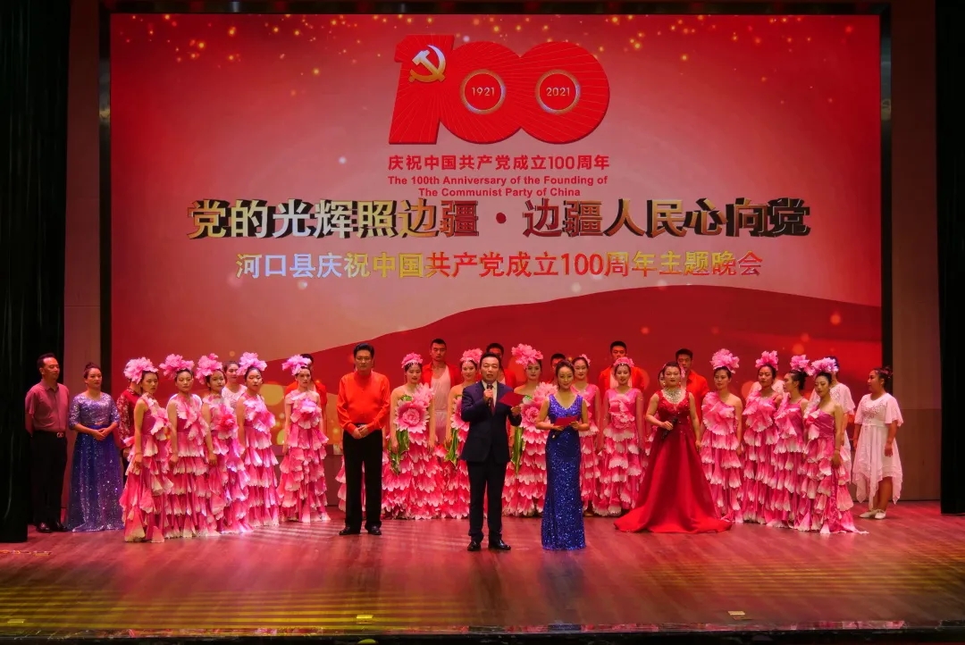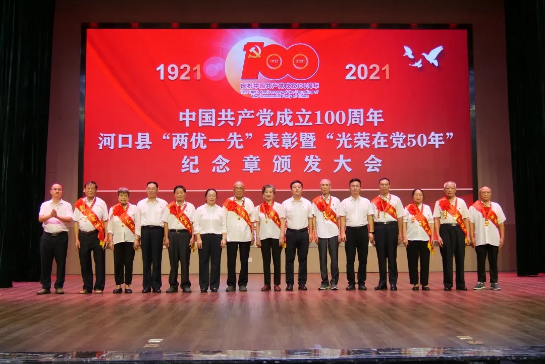 6月28日晚“党的光辉照边疆 边疆人民心向党”——河口县庆祝中国共产党成立100周年主题晚会在县人民医院礼堂举行。晚会开始前,隆重举行中国共产党成立100周年河口县“两优一先”表彰暨“光荣在党50年”纪念章颁发大会。县委书记于洋出席并致辞。县委副书记、县长邓瑞主持颁发大会。县委副书记王孝刚宣读县委关于“两优一先”表彰的决定。