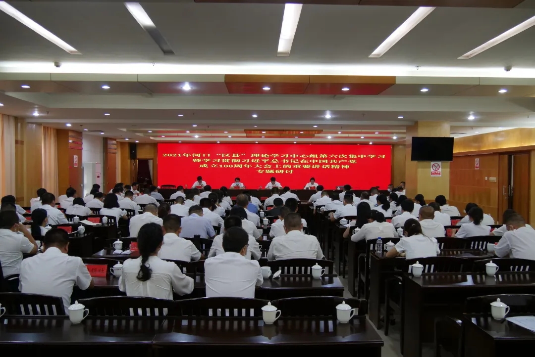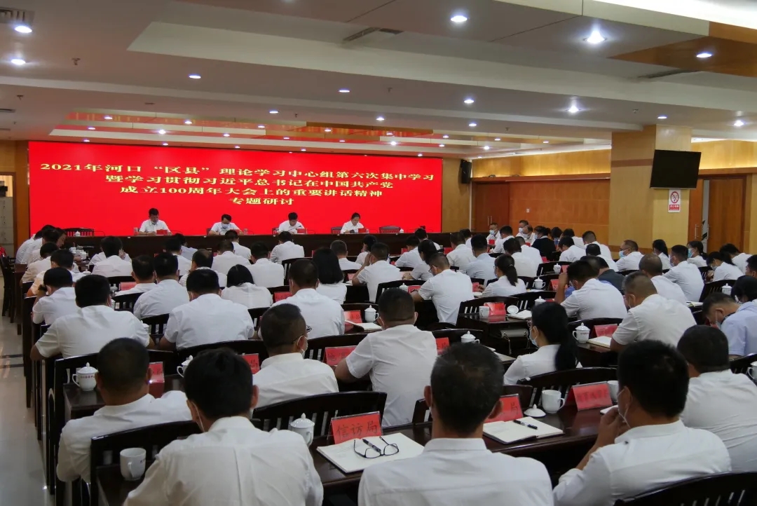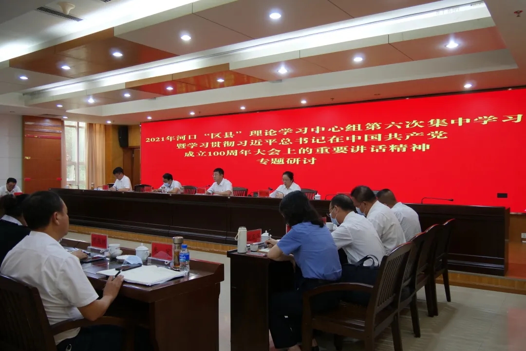 7月1日,河口县举行2021年“区县”理论学习中心组第六次集中学习暨学习贯彻习近平总书记在庆祝中国共产党成立100周年大会上的重要讲话精神专题研讨。县委书记于洋主持学习研讨并讲话。