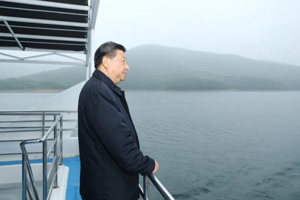 5月14日上午,中共中央总书记、国家主席、中央军委主席习近平在河南省南阳市主持召开推进南水北调后续工程高质量发展座谈会并发表重要讲话。这是座谈会前,习近平于13日在南阳市淅川县乘船考察丹江口水库。新华社记者 王晔 摄