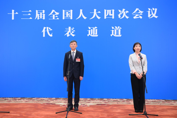 3月5日,第十三届全国人民代表大会第四次会议举行首场“代表通道”采访活动。这是全国人大代表苏伯民(左)、查艳通过网络视频方式接受采访。新华社记者 金良快 摄