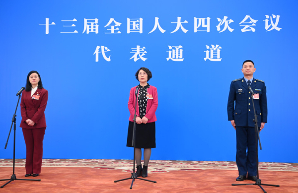 3月5日,第十三届全国人民代表大会第四次会议举行首场“代表通道”采访活动。这是全国人大代表袁晶、郭艳玲、余海龙(从左至右)通过网络视频方式接受采访。新华社记者 金良快 摄