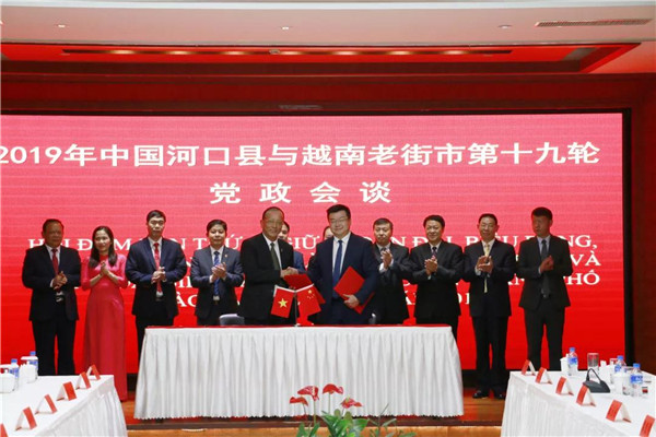 12月30日,以中共河口县委书记杜应昆为团长的河口县党政代表团与以老街省委常委、老街市委书记梅庭定为团长的越南老街市党政代表团在中国河口县举行第19轮党政会谈。