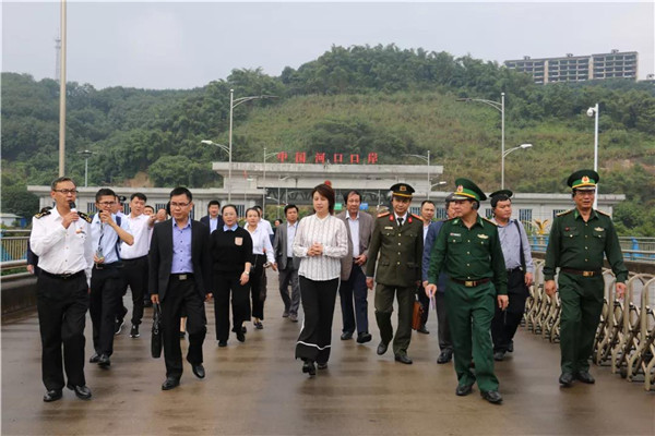 在中越红河公路大桥,联合调研组详细了解了河口县口岸基础建设和管理、通关便利化、中越贸易发展、口岸合作等工作情况。在听取相关情况工作汇报后,联合调研组指出,随着中国—东盟自由贸易区的建设发展,越南在中国—东盟自由贸易区建设中的作用越来越显著,中国河口—越南老街在“两廊一圈”经济建设中有着独特的地理优势。双方要高度重视口岸建设,努力把中国河口—越南老街双方的国门建设成为面向东南亚和南亚的便利通道,为两国和东南亚经济发展作贡献。