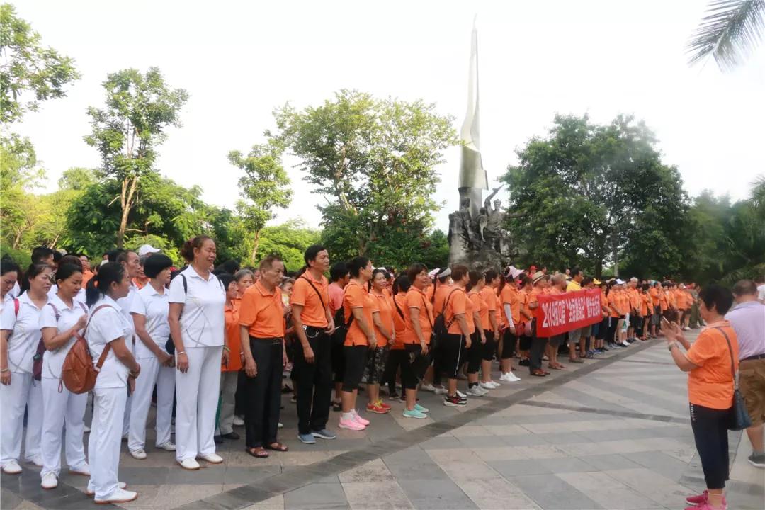 立秋的清晨空气爽朗,红河水潺潺流动,来自老体协的600多名健步走爱好走,身着橘色上衣,聚集在红河魂雕塑前,开启2019年“全民健身日”健步走活动。