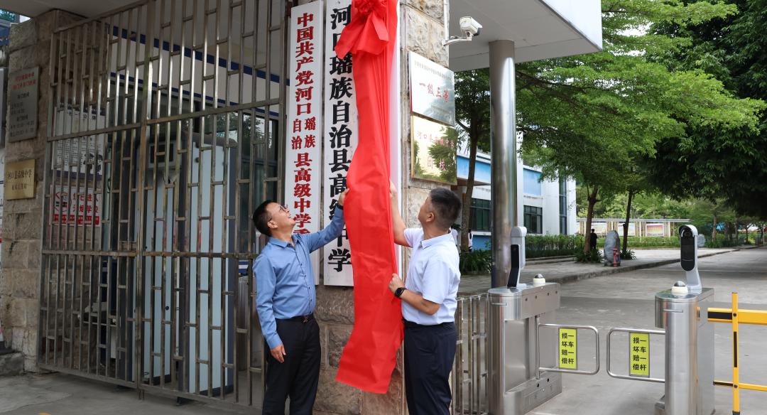 签约仪式结束后,与会领导一行前往河口县高级中学,孟庆红与卢光荣共同为“云南师范大学附属河口国门高级中学”揭牌。随后,参会领导实地走访调研校园,深入了解学校建设与发展情况,并宣布了校领导任免决定。