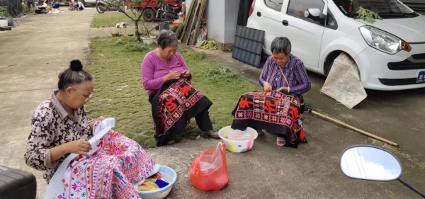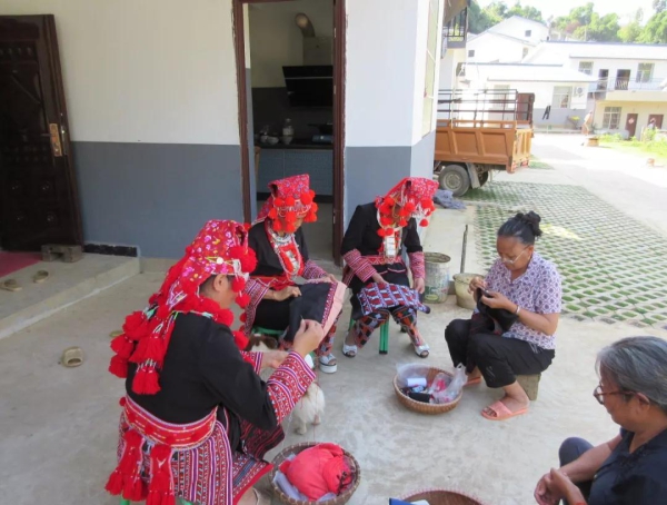 在湖广寨民族文化活动中心,我们还看到几台缝纫机。据副组长李友芬介绍,湖广寨的瑶族妇女都是刺绣织布做衣的能手。每当空闲时,他们就相约在民族文化活动室学习制作瑶家服饰。更多的时候,瑶家妇会三三两两地相约在一起刺绣,手工制作自己的民族服饰和一些民族手工作品。