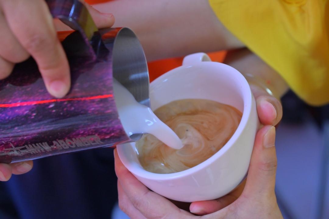 课堂上,讲师系统讲解了咖啡品种、产地特性、处理方法等理论知识,并现场演示了从咖啡豆研磨到冲煮的全流程。实操环节,教室里香气四溢,咖啡豆研磨后的焦香、萃取时的醇香、奶泡的甜香交织相融。磨豆、压粉、萃取、打奶泡、拉花……学员们分组练习,劲头十足,讲师站在一旁,细致纠正每一个动作,确保大家既能学会,又能做精。“以前只在店里喝过,没想到自己也能做出一杯有拉花的拿铁!”学员李阿姨兴奋地说。
