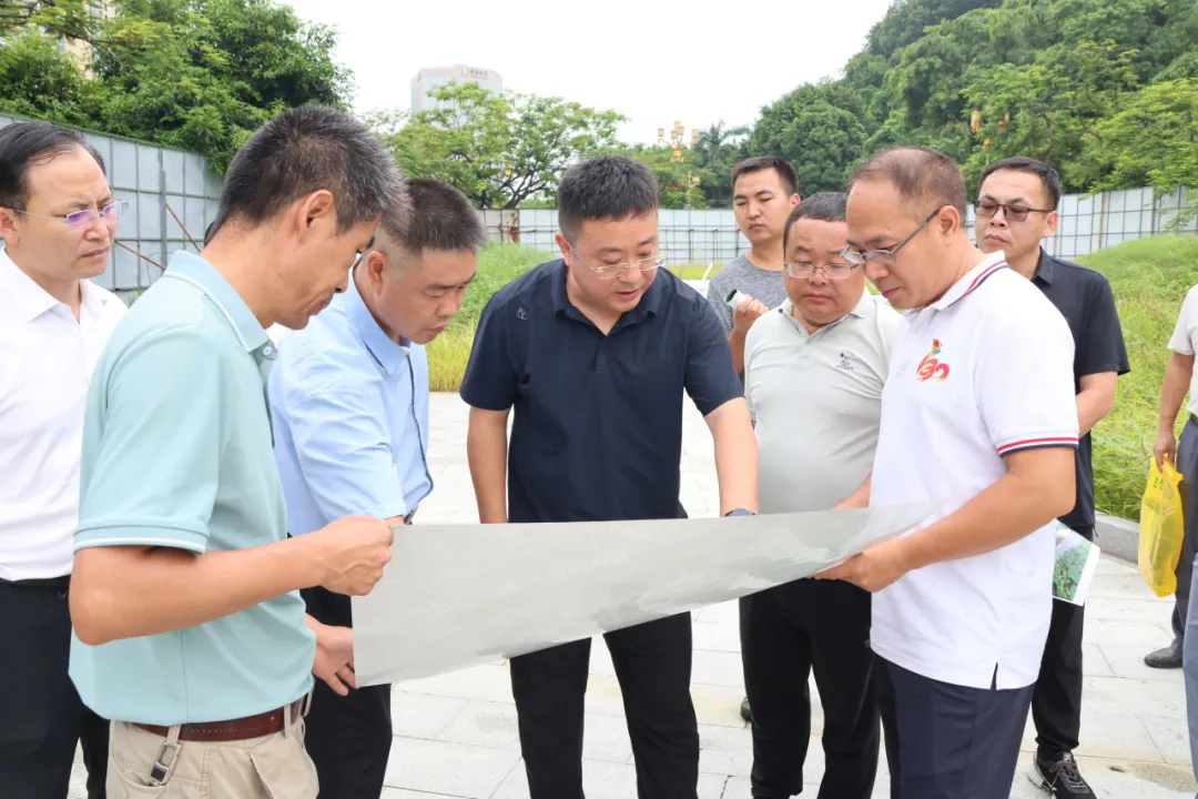 于洋(中)一行在滨河体育公园建设项目现场调研