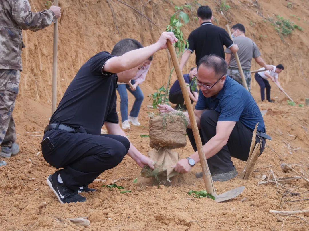 启动仪式结束后,大家拿起铁锹、锄头等工具,铲土造坑、培土压实、提水浇灌,县林草局相关负责同志还就植树事项进行解答与指导,现场一派繁忙景象。上午十点,经过大家的共同努力,1200株青皮柚苗已昂然竖立在山坡上,展示着盎然生机。