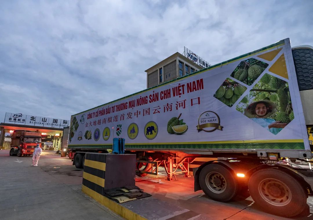 10月11日,载着17.28吨越南新鲜榴莲的冷链货车在河口公路口岸顺利办结通关手续,进入我国市场。这是云南省运用RCEP贸易规则,首票从越南进口的新鲜榴莲。这批新鲜榴莲产自越南得乐省,货值约53.568万元,从产地采摘到运输至越南金城口岸,大约需要2-3天时间。在河口口岸通关后将以昆明为中转中心,销往浙江嘉兴、广州、上海等地