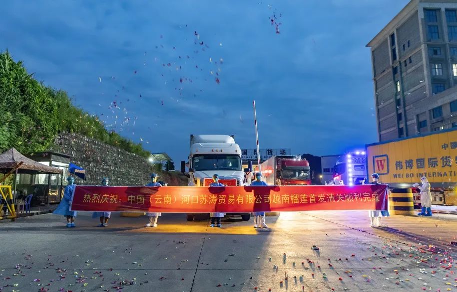 河口县充分运用RCEP规则,扩宽区域贸易合作。商务与关检部门积极对接,为进出口企业排忧解难。在这批新鲜榴莲从越南金城口岸运抵河口口岸过程中,采取了两步申报、鲜活农产品预约通关等措施,河口海关第一时间完成现场查检作业,为进口新鲜水果提供通关便利化服务,缩短通关时间。目前,这批榴莲已进入河口口岸进口冷链食品监管仓进行核酸检测,待核酸检测结果呈阴性后,再进入进口冷链食品货场进行消杀、驳货,方可流入国内市场。