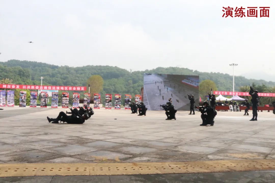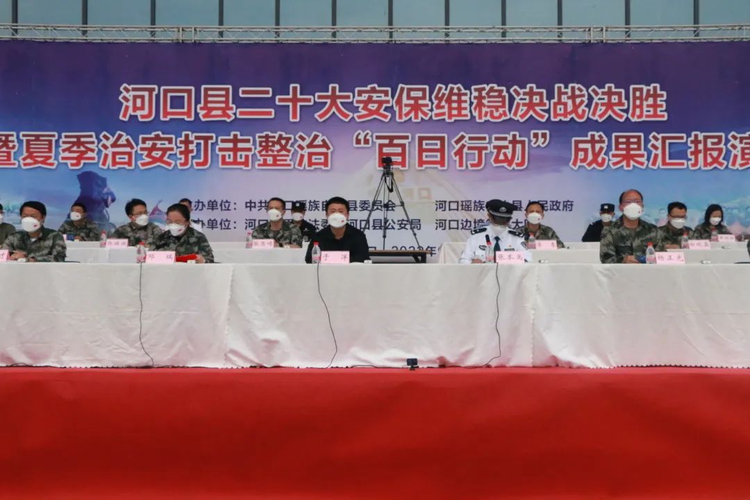 9月25日,河口县举办党的二十大安保维稳决战决胜暨夏季治安打击整治“百日行动”成果汇报演练,于洋、邓瑞、杨正光、林国才、杨光云等“区县”领导,红河边境管理支队支队长张本禹,县级相关部门负责同志及河口边境管理大队民辅警参加活动。